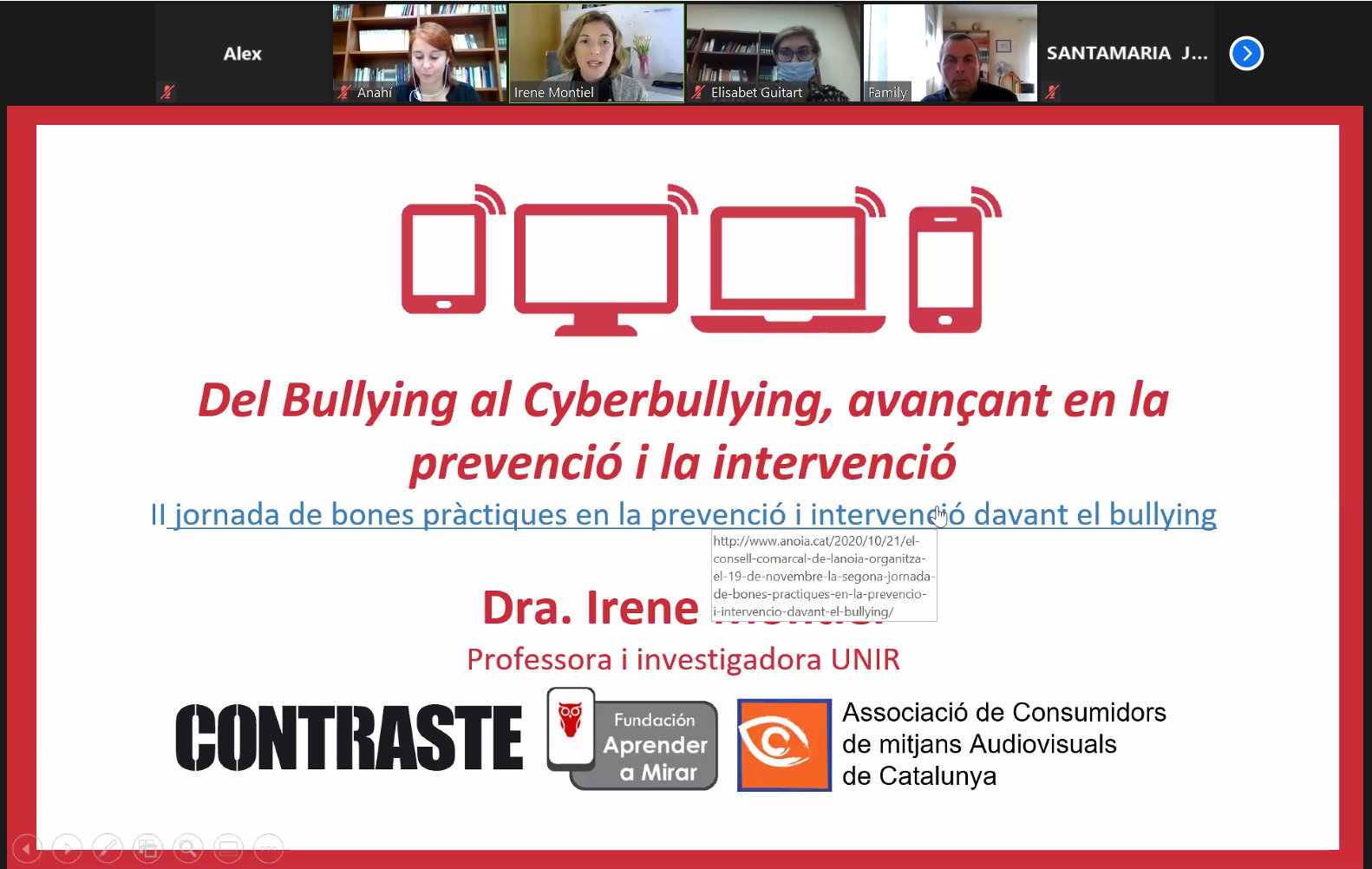 S'ha iniciat la Jornada amb la ponència marc "Del bullying al ciberbullying, avançant en la prevenció i la intervenció" a càrrec d'Irene Montiel, professora del Programa d'Educació Audiovisual CONTRASTE a càrrec de l'Associació de Consumidors de Mitjans Audiovisuals de Catalunya i de la Fundación Aprender a Mirar. En aquest sentit, també disposem de l'e-Taller adreçat a famílies i professorat.