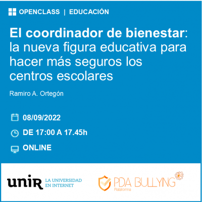 Ves-hiEl dijous 8 de setembre a les 17h (Hora península), a càrrec de Ramiro Ortegón, president de la Plataforma PDA Bullying, es va fer l'Openclass d'UNIR: El coordinador de bienestar: la nueva figura educativa para hacer más seguros los centros escolares.