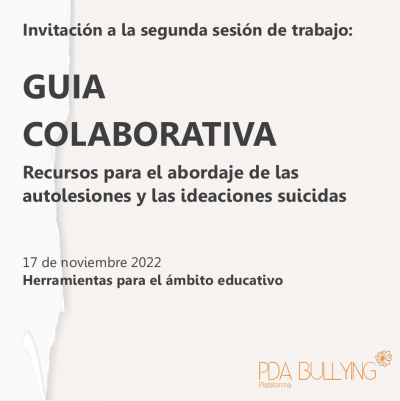 Ves-hiEl dijous 17 de novembre a les 18h (Madrid, UTC +1) convoquem la segona sessió de treball col·laboratiu en què diverses organitzacions compromeses amb les bones pràctiques PDA apostem per la creació de recursos i eines per a l'abordatge de situacions d'alta complexitat emocional dins d'entorns educatius. En aquesta ocasió, apostem per generar recursos que ajudin a donar resposta a les autolesions i les ideacions suïcides des de les competències pedagògiques.